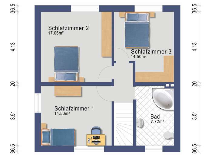 Im Obergeschoss sind drei gut geschnittene Schlafzimmer, die vielseitige Nutzungsmöglichkeiten bieten – sei es als Kinderzimmer, Arbeitsbereich oder Gästezimmer.