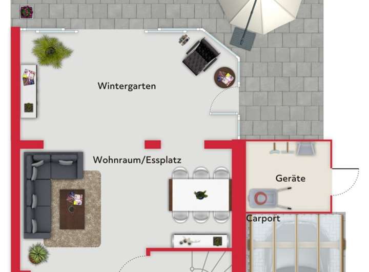 Zum Objekt gehören eine Garage mit elektrischem Schwingtor sowie eine Carportanlage nebst Geräteraum und Außenstellplätze.
