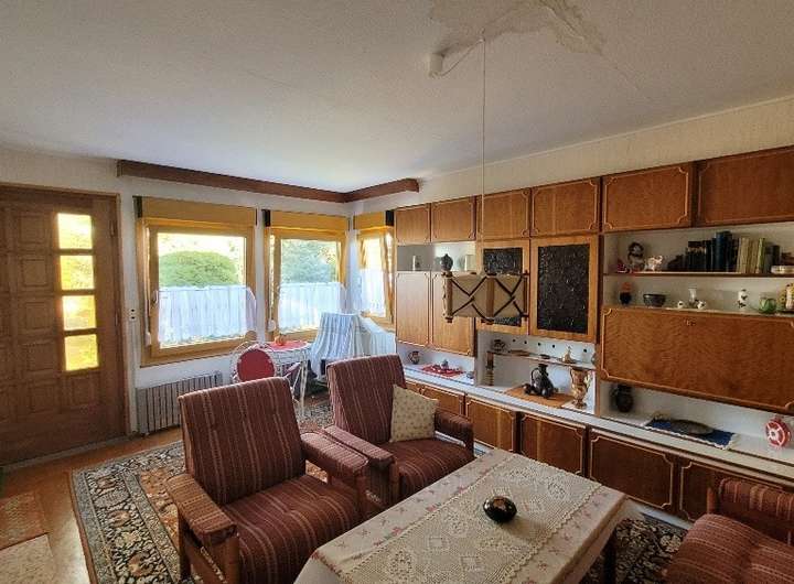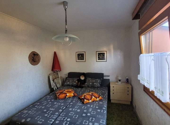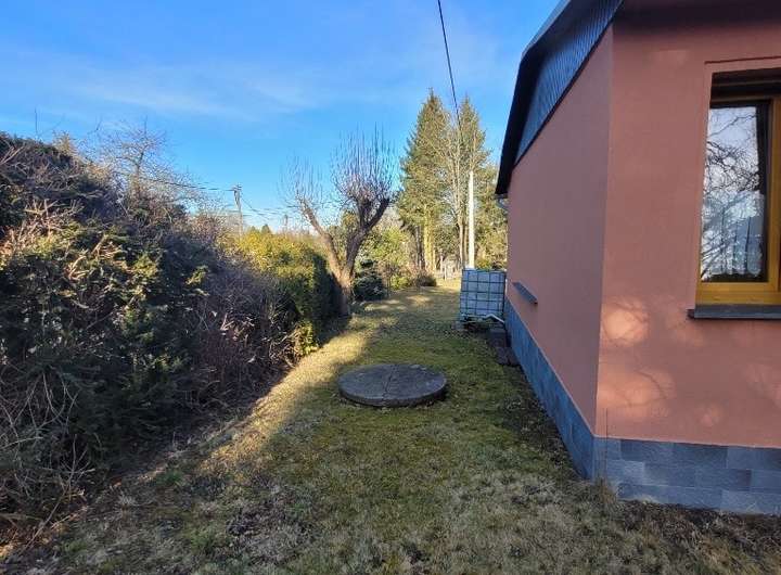 Das Wochenendhaus ist teilweise unterkellert und verfügt über ein Flachdach, welches im Jahr 2025 letztmalig tlw. neu eingedeckt wurde. Im Häuschen befinden sich zwei Zimmer, 1 Küche, Bad und Garage.