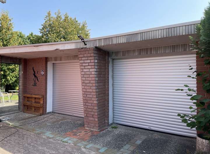Zum Angebot gehört eine Doppelgarage mit angebautem Partyraum und Nebengebäude für Gartengeräte.