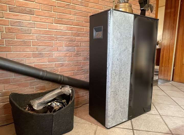 Im Wohnzimmer ist ein Pelletofen aufgestellt.