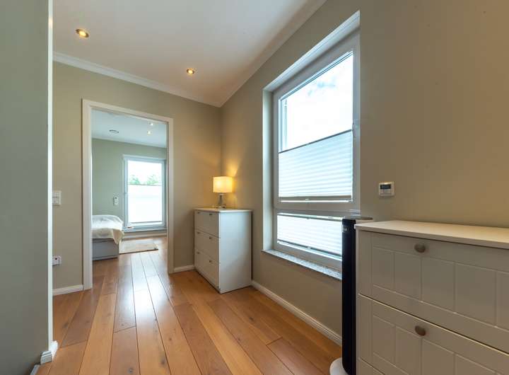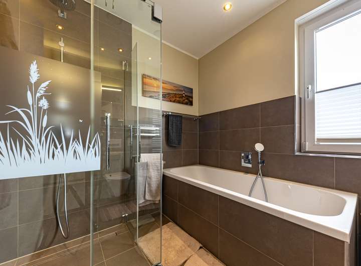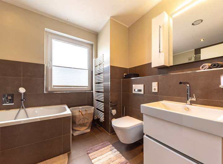 Das große Tageslichtbad macht die Etage perfekt. Mit Wanne und separater Dusche ist es nicht nur ein funktionaler Raum, sondern ein Ort des Wohlfühlens. Morgens starten Sie hier energiegeladen in den Tag, abends wird das Bad zum privaten Rückzugsort für Ruhe und Entspannung.