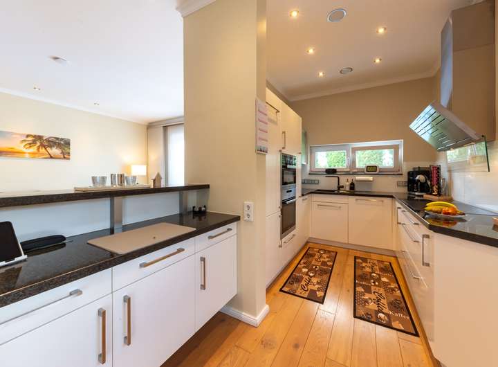 Die offene Küche ist dabei mehr als ein funktionaler Raum – sie ist der Treffpunkt für Familie und Freunde. Hier entstehen Gespräche beim Kochen, gemeinsames Lachen beim Zubereiten und Erinnerungen, die bleiben. Von hier aus öffnet sich der Weg auf die Terrasse und in den liebevoll angelegten Garten. Ein Ort, der je nach Jahreszeit eine andere Geschichte erzählt: fröhliches Kinderlachen im Sommer, duftende Blüten im Frühling, gesellige Abende im Spätsommer, goldene Blätter im Herbst. Ob Grillfeste mit Freunden, Toben mit den Kindern oder leise Momente bei einem Glas Wein – hier entsteht der ganz persönliche Lebensmittelpunkt im Freien.