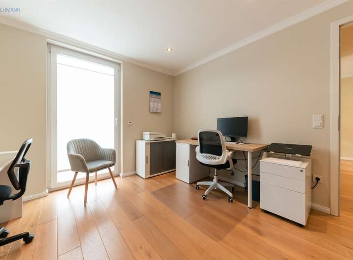 Ein zusätzliches Zimmer im Erdgeschoss erweitert die Flexibilität: als Büro für konzentriertes Arbeiten, als Gästezimmer für liebe Besucher oder als Hobbyraum für persönliche Leidenschaften. Das moderne Gäste-WC mit Dusche rundet diese Ebene ab – praktisch, stilvoll und durchdacht.
