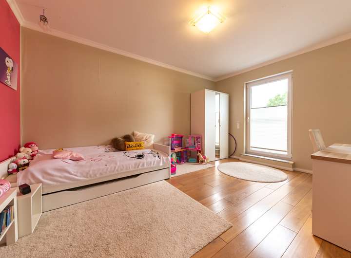 Im Obergeschoss entfaltet sich die private Welt der Familie. Zwei helle Kinderzimmer laden zum Spielen, Träumen und Wachsen ein. Hier entstehen Rückzugsorte voller Fantasie und Geborgenheit, die mit den Kindern mitwachsen können. Das Elternschlafzimmer mit Zugang zum Balkon schenkt einen besonderen Platz der Ruhe. Stellen Sie sich vor, Sie öffnen morgens die Balkontür, lassen frische Luft herein und beginnen den Tag mit einem tiefen Atemzug Gelassenheit.
