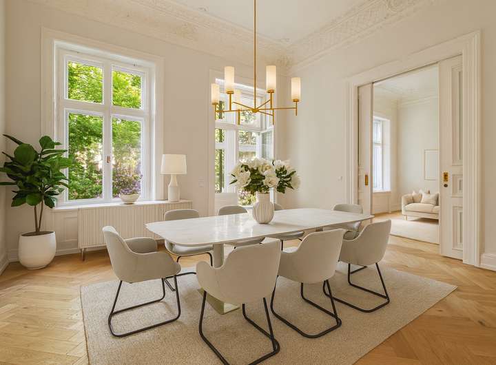- Geräumiges Treppenhaus und aufwendig restaurierte Stuckdecken
