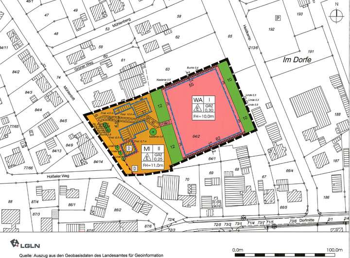 Das Grundstück befindet sich in einem allgemeinen Wohngebiet und ist für die Bebauung mit einem Einfamilienhaus mit einem Vollgeschoss vorgesehen. Die Grundflächenzahl (GRZ) beträgt 0,30, das heißt, maximal 415 m² der Grundstücksfläche dürfen mit Gebäuden bebaut werden – ausreichend Platz für ein großzügiges Zuhause mit Garten und Terrasse.