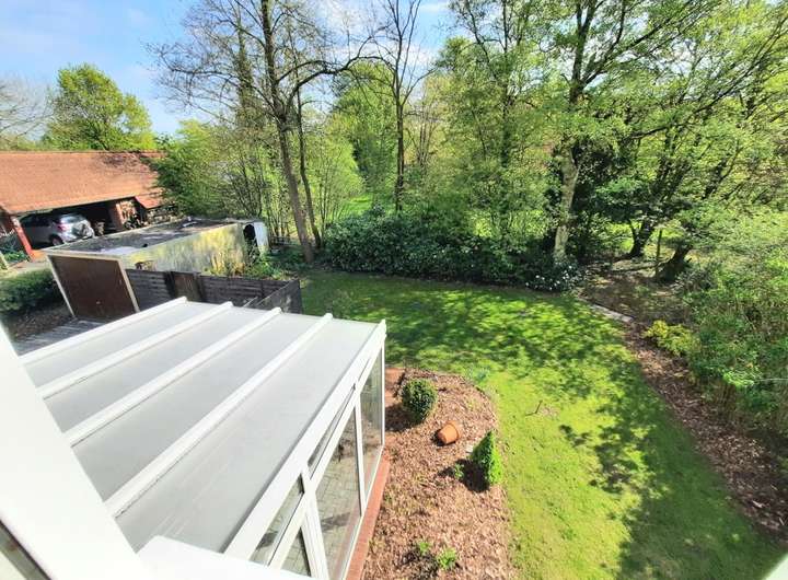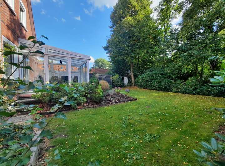 Der Gartenbereich ist von der Straße aus uneinsehbar und pflegeleicht angelegt, der Vorgarten mit diversen kleinen eingefassten Beeten. Der Vorgarten-/Eingangsbereich wurde im Jahre ´99 neu ausgepflastert und mit pflegeleichten Beeten (umrandet) versehen. Im hinteren Gartenbereich befindet sich im 90-Grad-Winkel, um den 1995 auf einem Fundament errichteten Wintergarten ein eingefasstes Hanglagenbeet sowie ein Steingartenhochbeet. Zu den Nachbargrundstücken wurde der Gartenbereich mit hohen Rhododendronhecken, Pfeifenziersträuchern (Duftjasmin) und neuen Sichtschutzzaunelementen eingefriedet. Der Gartenbereich mit dem schönen, hellen Wintergarten ist natürlich nach Süden ausgerichtet. Im hinteren Bereich des Grundstücks befindet sich eine PKW-Garage und zwei weitere Stellplätze. Die Zaunanlagen wurden zwischen 2023 und 2025 fachgerecht erneuert.