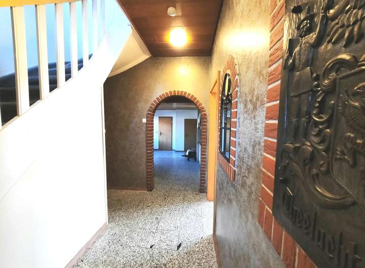 Das Objekt hat eine wirklich gute Bausubstanz und bietet dem zukünftigen Eigentümer viel Potenzial, nicht zuletzt durch die gute, sinnvolle Raumaufteilung. Dieses große Objekt lässt sich mit wenig Aufwand in ein Zweifamilienhaus verwandeln. Eine entsprechende Genehmigung für die Nutzung als Zweifamilienhaus, liegt seit Erstellung vor, wurde aber nie genutzt. So hätte der zukünftige Eigentümer die Möglichkeit, eine Wohnung im Erdgeschoss und eine weitere Wohnung im Obergeschoss einzurichten. Die Hausanschlüsse lassen sich problemlos in die obere Etage verlegen bzw. sind dort schon z. T. vorhanden. Im Jahre 1998 erfolgte dann ein neuer, großer, genehmigter Anbau, für den zunächst etwa 70% des alten, damals eingeschossigen Arkaden-Ostflügels abgetragen wurden. Der Anbau wurde dabei bis in die Dachspitze ausgebaut. Der Dachstuhl wurde dabei komplett erneuert, das Klinkerwerk ebenfalls. Die Fenster nach Osten zeigend, wurden alle erneuert, ebenso ein Dachfenster. Der Haupteingang wanderte dabei von der Ostseite auf die Nordseite. Die gesamte Dacheindeckung wurde Mitte der 90er Jahre komplett erneuert. Dabei wurde die Schleppdachgaube auf der Westseite auf nun vier gleichgroße Fenster erweitert, das dem Flur und einem weiteren Schlafzimmer im Obergeschoss zugute kommt. Alle Fenster (auch die von Bad und WC) verfügen über manuell zu betätigende  Außenjalousien. Das Objekt ist zu etwa 60% teilunterkellert. Der Keller ist ein Vollgeschoss.