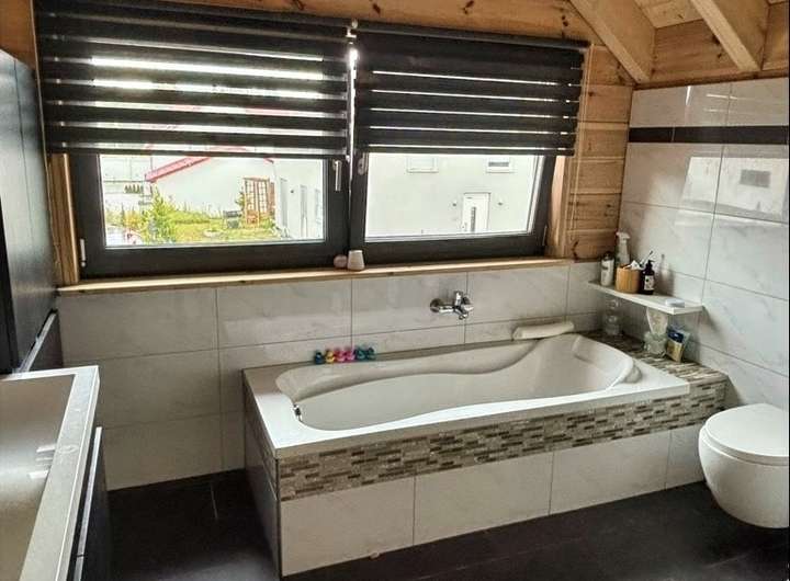 - Großzügiges Badezimmer mit Badewanne, Dusche, Waschbecken und WC
