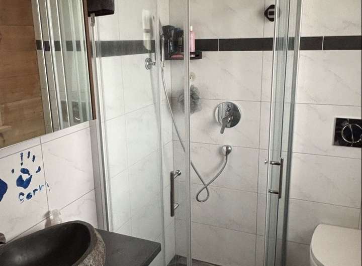 - Badezimmer mit Dusche, Waschbecken und WC