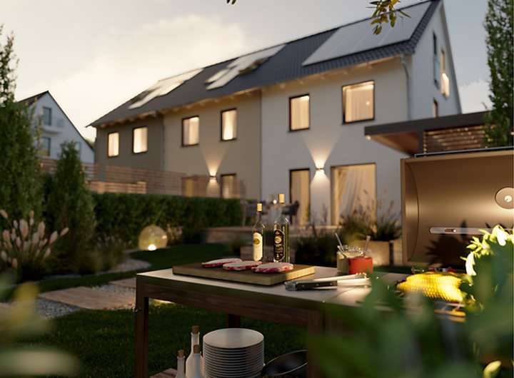 Vollausstattung inklusive – Sie wählen Ihr Traumhaus, wir bauen regional. • Wärmepumpe: Heute bereits an Morgen denken - in jedem Haus ist eine Wärmepumpe inklusive. Sie erfüllen die aktuellen Energiestandards, sparen bares Geld und reduzieren Ihren CO2-Fußabdruck. • Massiv gebaut und gedämmt: Wir setzen auf massives Mauerwerk. Das schont nicht nur Ressourcen und Ihr Budget, sondern dämmt auf ganz natürlichem Weg und ohne schädliches Styropor. • Fußbodenheizung: Warme Füße? Auch die Fußbodenheizung ist inklusive. Sie steigert nicht nur den Wert Ihres Hauses, sondern sorgt ganz nebenbei noch für echtes Wohngefühl. • Vorrüstung E-Auto: Wir denken nicht nur mit, sondern setzen auch direkt um. Alle unsere Häuser haben eine E-Auto Vorrüstung. Damit sind sie mobil, flexibel und bleiben beweglich. • Rollläden: Ihr Haus sorgt nicht nur für ausreichend Sicherheit, sondern auch für einen sommerlichen Wärmeschutz. Bereits inklusive sind die Rollläden. • Vorrüstung Photovoltaik: Auch wenn es um Energie geht, können Sie sich sicher sein. Mit der Photovoltaik-Anlagebleiben Sie flexibel und machen sich unabhängig von steigenden Energiepreisen. Ausreichend Platz für einen Energiespeicher bietet Ihr Hausanschlussraum. • Schlüsselfertig: Ihr Haus wird Ihnen, am Ende der Bauzeit, schlüsselfertig übergeben. Sie richten sich ganz nach Ihrem Geschmack ein. • Sicher gebaut: Ihr persönlicher Hausbau-Schutzbrief schützt Sie mit einem garantierten Festpreis, einer Bauzeitgarantie und transparenten Baukosten. Ohne Tapezier- und Bodenverlegearbeiten. Abbildungen können Sonderwünsche enthalten.