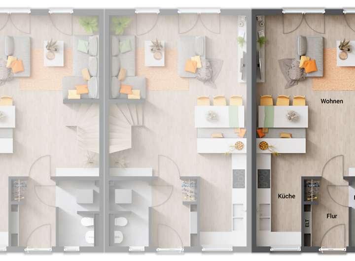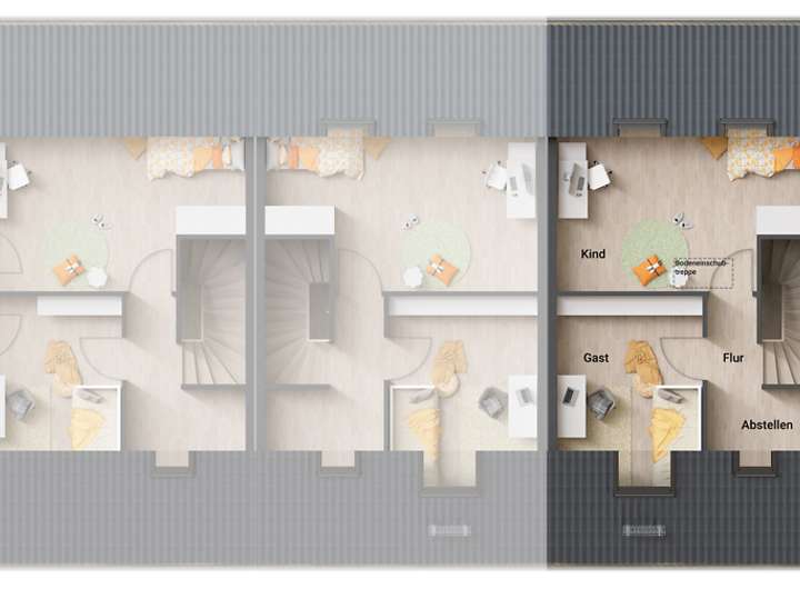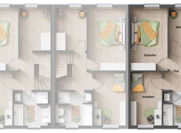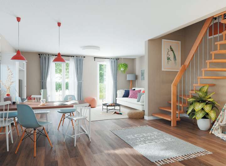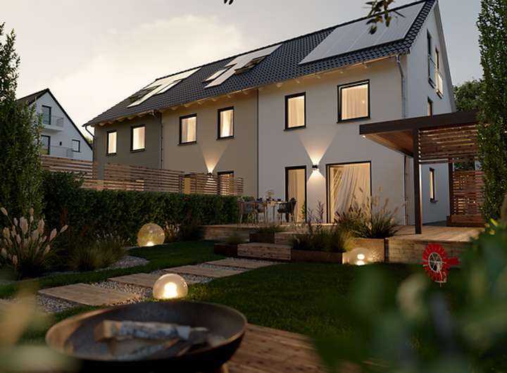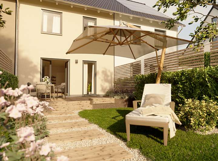 Ihr neues Zuhause im Reihenhaus – Viel Raum, Gemeinschaft und individuelle Gestaltungsmöglichkeiten Ein Reihenhaus ist die perfekte Lösung für alle, die sich großzügigen Wohnraum wünschen, aber gleichzeitig in einer Region bauen möchten, in der Grundstücke knapp sind. Das Mainz 128 wird in klassischer Bauweise als harmonische Reihe von vier Häusern errichtet. Hier leben vier Familien quasi unter einem Dach – profitieren Sie von einer freundlichen Nachbarschaft und einer lebendigen Hausgemeinschaft. Gleichzeitig bleibt genügend Raum, um Ihre persönliche Note einzubringen und Ihr Zuhause ganz nach Ihren Wünschen zu gestalten. Im Erdgeschoss erwartet Sie ein großzügiges Wohnzimmer mit einem einladenden Essbereich. Die hohen Fenster sorgen für viel Tageslicht und bieten einen schönen Blick in den Garten – perfekt für entspannte Stunden im Freien oder gesellige Zusammenkünfte. Über den geschwungenen Treppenaufgang gelangen Sie ins Obergeschoss, das mit einem gemütlichen Schlafzimmer, einem Gästezimmer und einem geräumigen Kinderzimmer aufwartet – ideal für Familien und individuelle Bedürfnisse. Das Highlight befindet sich im Dachgeschoss: Hier schlägt das Herz aller Kreativen höher – ein großzügiges Studio bietet den perfekten Raum für Hobbys, Arbeit oder einfach zum Entspannen. Zusätzlich gibt es einen praktischen Abstellraum, der für Ordnung sorgt. Das Reihenhaus Mainz verbindet gemeinschaftliches Wohnen mit viel Raum für Ihre persönliche Entfaltung – eine ideale Kombination für ein harmonisches und individuelles Zuhause. Der Preis für Ihr schlüsselfertiges Haus beträgt 286.150€. Als Grundstückspreis wurden 165.000€, zzgl. Baunebenkosten berücksichtigt.