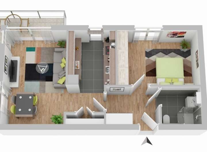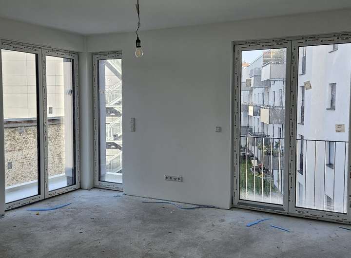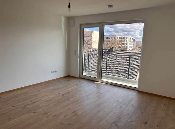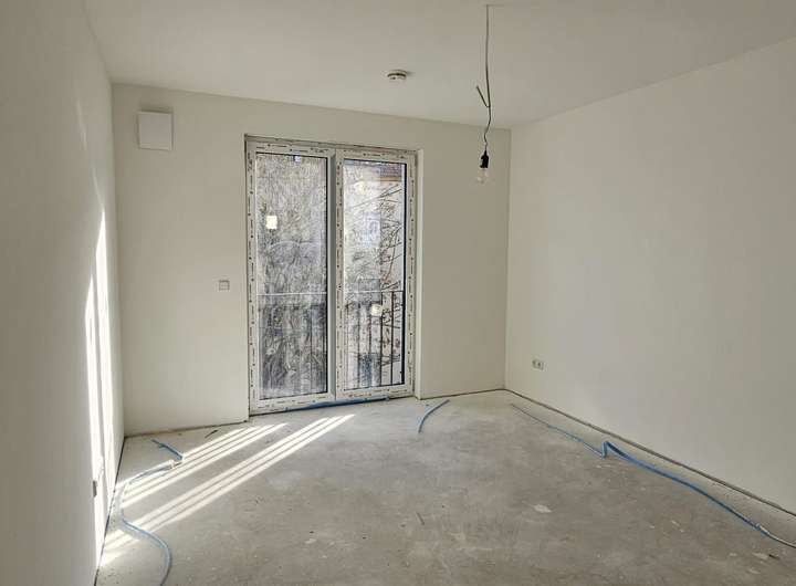Diese helle 2-Zimmer-Wohnung befindet sich im ersten Stock eines modernen Wohngebäudes, das 2023 erbaut wurde. Mit einer Wohnfläche von 58,6 m² bietet die Wohnung eine durchdachte Raumaufteilung mit einem Schlafzimmer, einem Badezimmer und einem offenen Wohnbereich, der zu einem kleinen Balkon führt. Die großen Fenster lassen viel Tageslicht herein und bieten einen Blick auf die baumgesäumte Straße.
