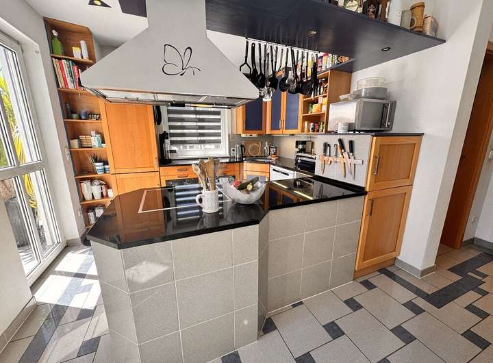 Die helle Küche mit angrenzender Speisekammer und direktem Terrassenzugang ist halboffen gestaltet und im Kaufpreis enthalten.