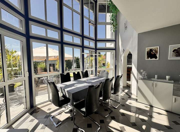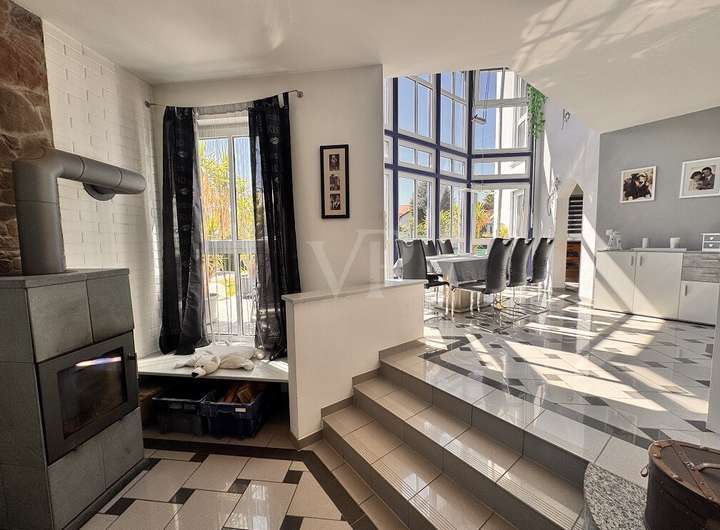 Der Wohnbereich überzeugt durch einen offen gestalteten Grundriss und eine große, ca. 4 Meter hohe Glasfront Richtung Süden, die viel Tageslicht einlässt, durch elektrische Jalousien flexibel beschattet werden kann und den herrlichen Blick in den Garten gewährleistet. Die sorgfältig verlegten Granitböden mit Intarsienarbeiten verleihen den Räumen einen zeitlosen und repräsentativen Charakter. Für schöne Wärme sorgt sowohl die teilweise verlegte Fußbodenheizung als auch der Holzofen im Wohnzimmer.