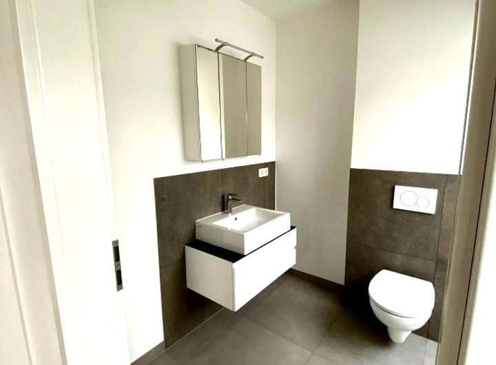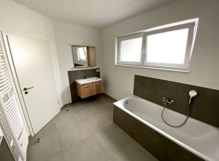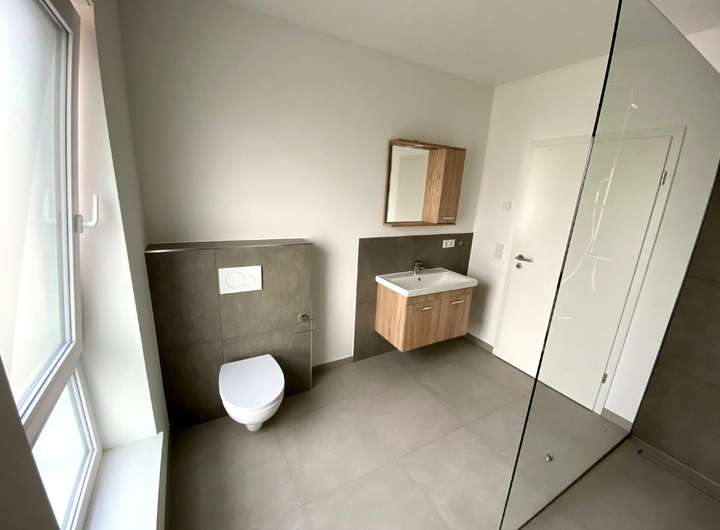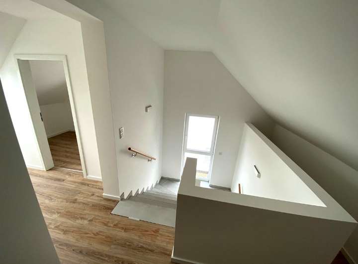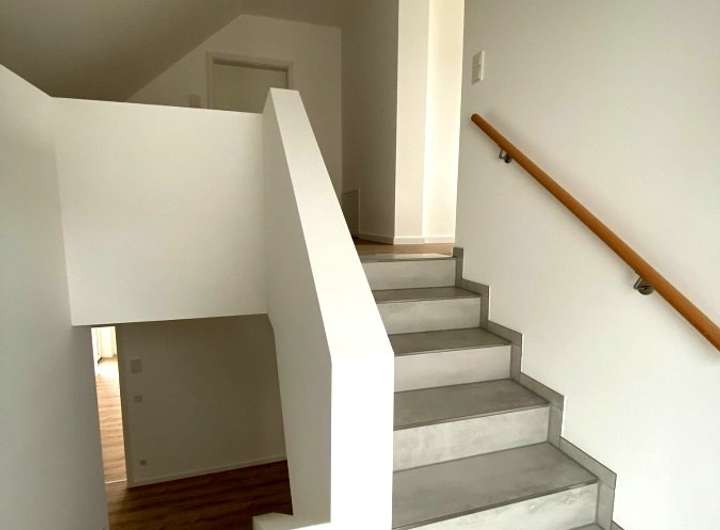 Über den stilvollen Treppenaufgang in Betonoptik erreichen Sie das Obergeschoss. Hier erwarten Sie drei helle Schlafzimmer sowie zwei hochwertig ausgestattete Badezimmer. Das Elternbad verfügt über einen Handtuchheizkörper. Der Elternbereich begeistert zusätzlich mit einer eigenen Ankleide und Zugang zur großzügigen Dachterrasse. Ein Hauswirtschaftsraum und eine Loggia komplettieren diese Etage.
