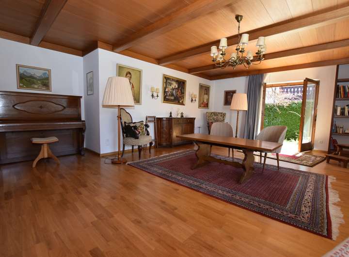 Im Erdgeschoss befindet sich eine große aber modernisierungsbedürftige Wohnung welche seit kurzem frei ist. Das sehr großzügige Wohnzimmer und der lichtdurchflutete Wintergarten mit Kachelofen (hier muss der Einsatz erneuert werden), laden zum Verweilen und Entspannen ein. Die großzügige Terrasse nach Osten und Süden erweitert den Wohnraum nach draußen und ist ideal für gesellige Stunden im Freien. Der liebevoll angelegte Garten lädt zum Spielen, Grillen und Gärtnern ein und bietet viel Raum für individuelle Gestaltungsideen.