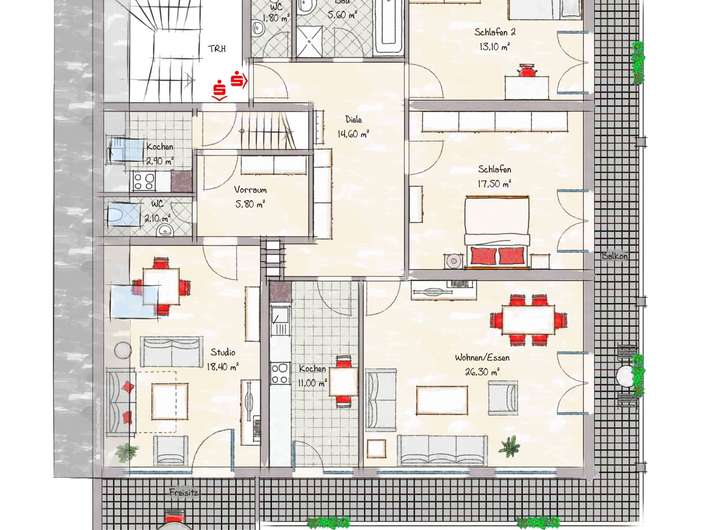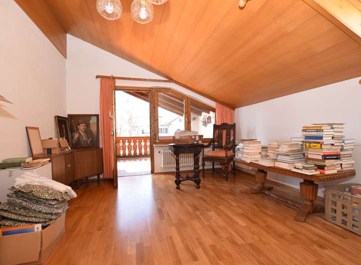 Weiterhin findet sich im Obergeschoss das schon erwähnte Studio mit kleiner Küche und einem WC. Dieses kann entweder als Büro, Gästeraum oder auch als zusätzlicher Wohnraum für die Erdgeschosswohnung dienen. Das Highlight dieses Studios ist der großzügige Freisitz. Bisher wurde das Studio von den Bewohnern der Erdgeschosswohnung genutzt und ist somit ebenfalls frei.