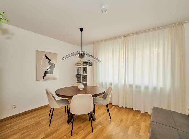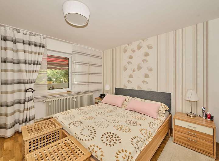 Die Küche verfügt über genügend Raum für einen kleinen Essbereich. Die aktuell eingebaute Küche ist Eigentum der Verkäufer und wird von diesen nicht mitveräußert. Zwei Schlafzimmer ermöglichen eine flexible Nutzung, etwa als Schlafraum, Kinderzimmer oder Homeoffice.