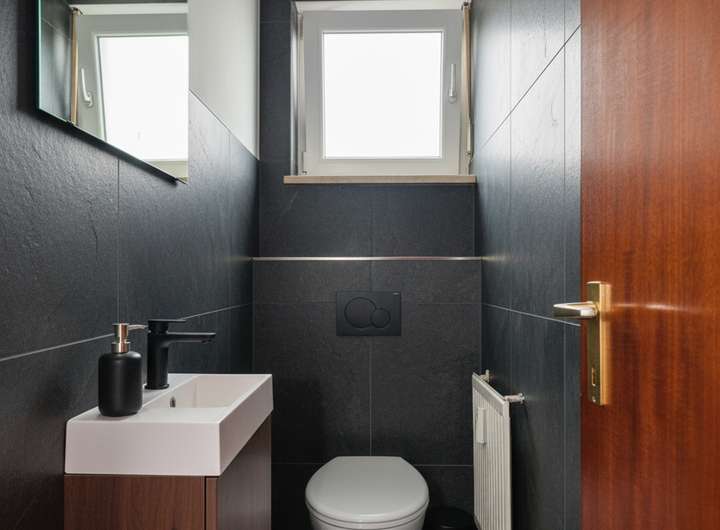Das Tageslichtbad ist mit einer Badewanne ausgestattet. Ein separates WC, ebenfalls mit Fenster, ergänzt die sanitären Einrichtungen sinnvoll. In Bad und WC wurden Fliesen verlegt, in den übrigen Räumen kommen Parkett- und Laminatböden zum Einsatz.