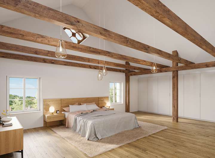 Dennoch behalten die Räume ihren alten gemütlichen Charakter. So wird die Balkenlage aus dem früheren Heulager im Dachgeschoss erhalten und sorgt damit für ein ganz besonderes Raumgefühl.