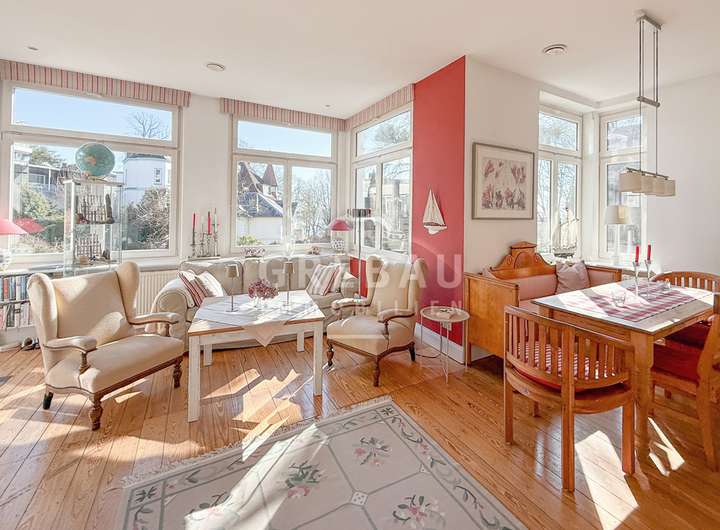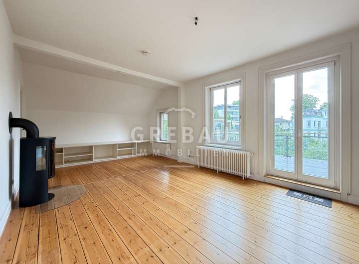 - lichter Wohn-/ Essbereich mit kleinem, seitlichen Elbblick und herrlichen Blicken in den Garten und das Blankeneser Hanggebiet sowie Kamin und Pitchpinedielenboden