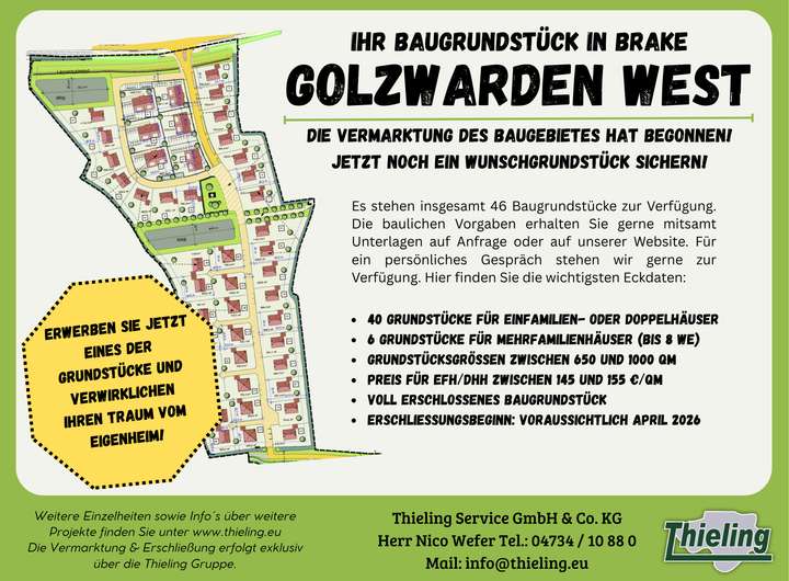 Die Thieling Gruppe plant die Erschließung eines ca. 5,5 ha großen Neubaugebietes im schönen Ortsteil Golzwarden der Stadt Brake (26919).