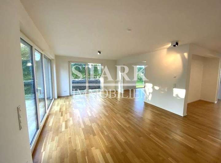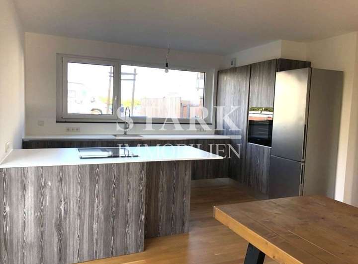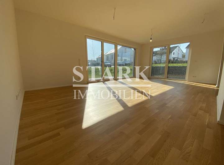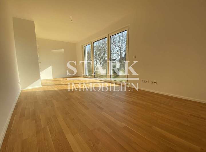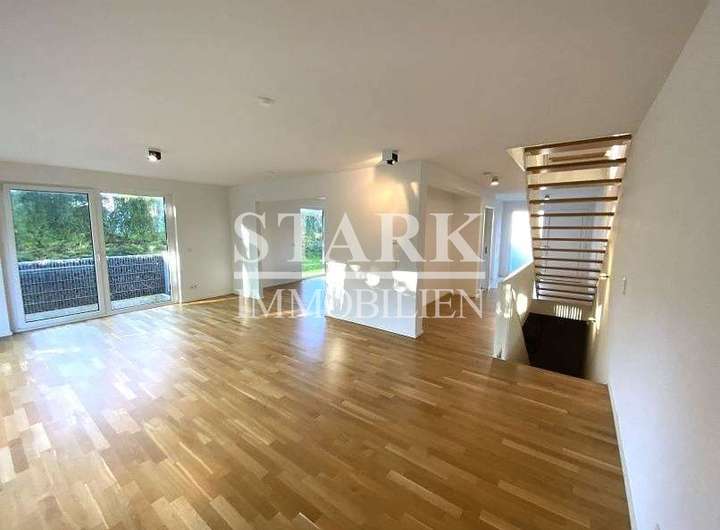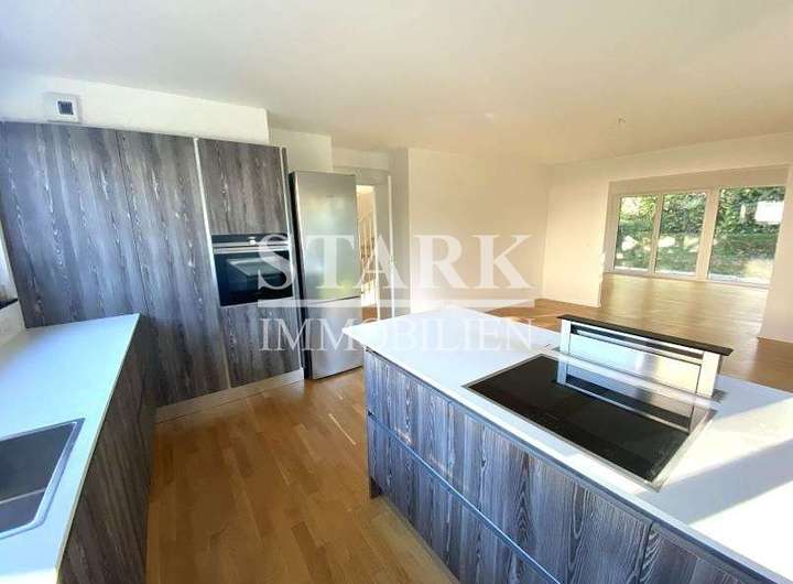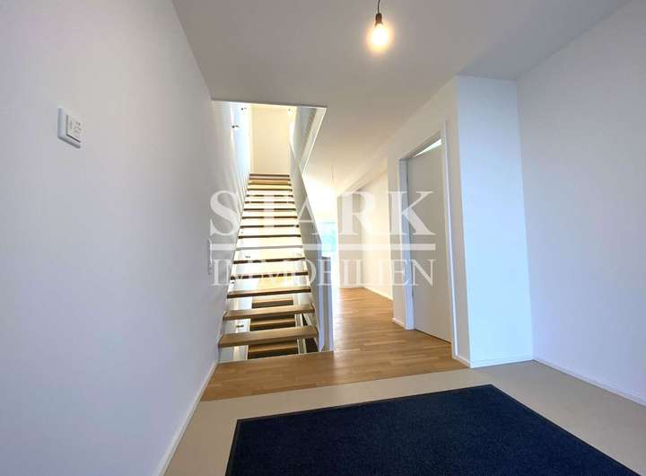 Bereits beim Betreten des Hauses empfängt Sie ein großzügiger Eingangsbereich mit ausreichend Platz für eine Garderobe. Herzstück des Erdgeschosses ist der offen gestaltete Wohn- und Essbereich mit moderner Einbauküche samt Kochinsel und Theke. Große, bodentiefe Fensterfronten sorgen für ein helles Wohnambiente und gewähren direkten Zugang zur sonnigen Südwest-Terrasse sowie in den Garten. Elektrische Außenjalousien bieten dabei Sonnen- und Sichtschutz.