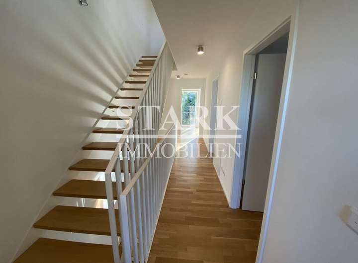 Über die Vollholztreppe gelangen Sie in die oberen Etagen. Im 1. Obergeschoss befinden sich drei helle, gut geschnittene Schlafzimmer sowie ein modernes Tageslichtbad mit bodentiefer Walk-in-Dusche und Badewanne.