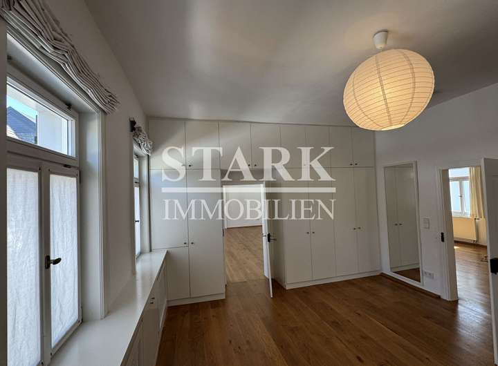 • maßgefertigte Schreinereinbauten, darunter ein Schlafzimmerschrank sowie eine elegante Bücher- und Schrankwand im Wohnzimmer