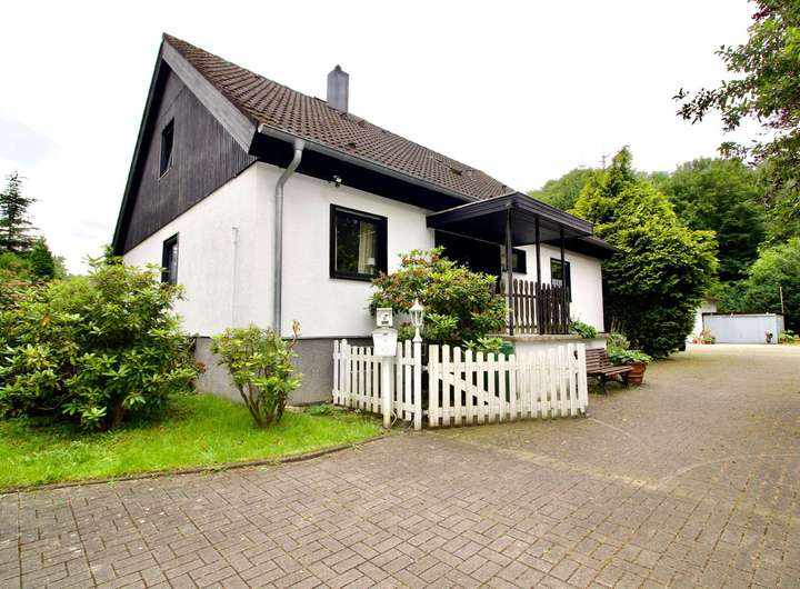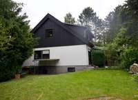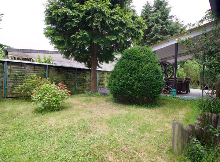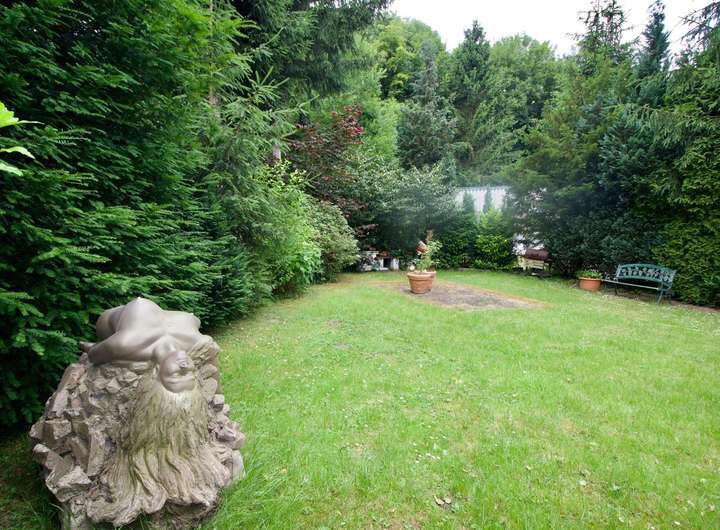 Außenbereich: Der Garten mit einer Fläche von 800 m² bietet viel Raum zum Entspannen und Genießen. Zudem bietet das Grundstück einen privaten Waldzugang und eine eigene Grundwasserquelle.