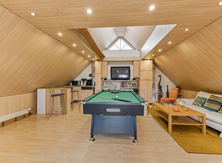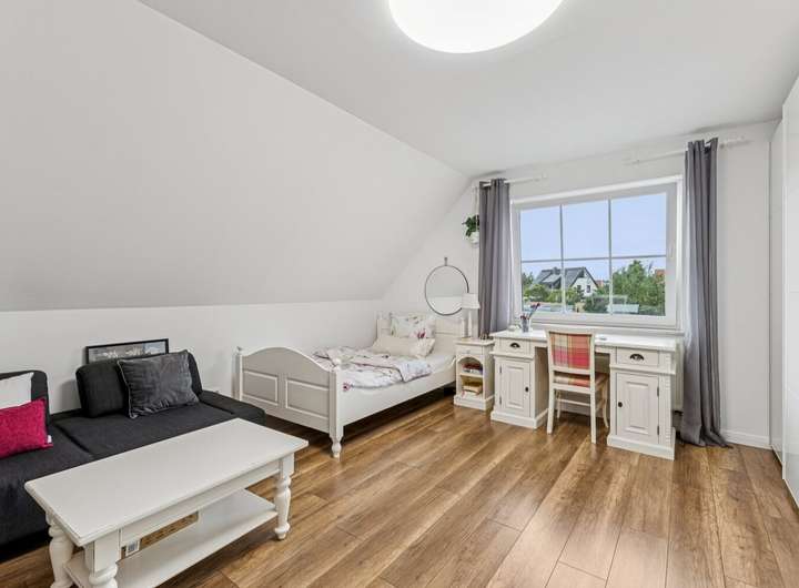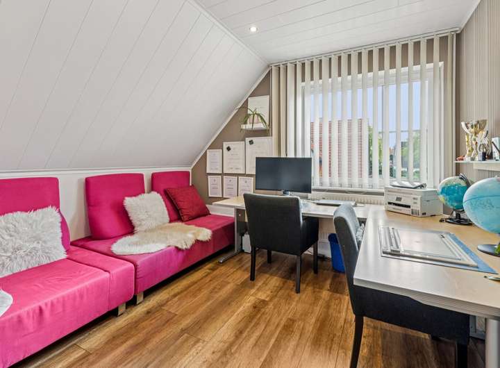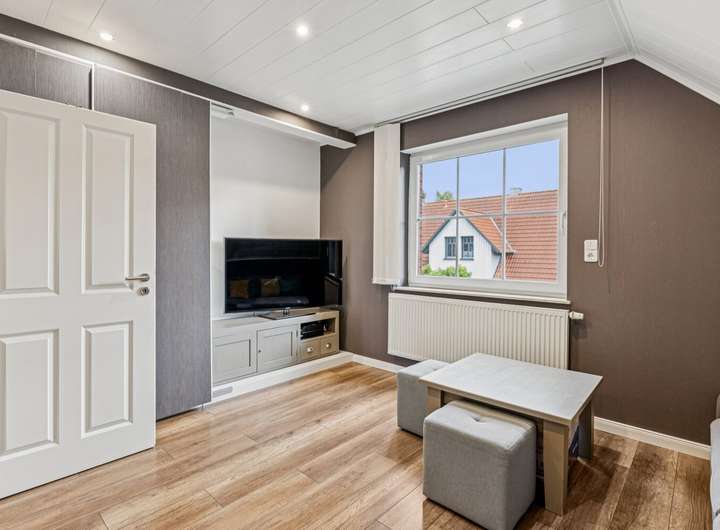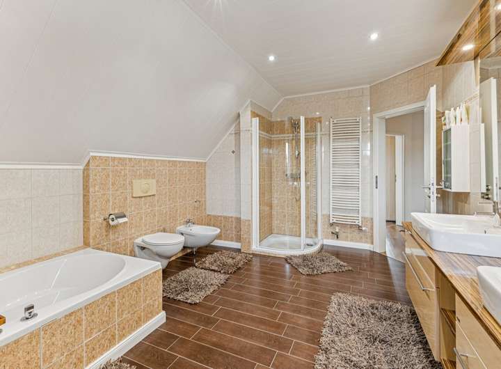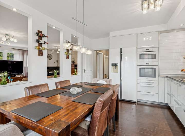 Insgesamt sieben Zimmer – darunter vier Schlafzimmer, ein weitläufiges Wohnzimmer sowie zwei vollausgebaute Böden (2010) – eröffnen flexible Nutzungsmöglichkeiten. Ein Gäste-WC sowie die 2012 installierte halboffene Design-Küche unterstreichen den hohen Wohnkomfort.