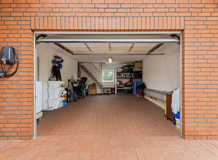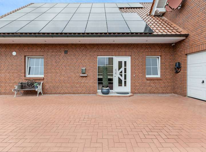 Der Hofbereich ist mit pflegeleichten Klinkerpflastersteinen verlegt und bietet eine repräsentative Einfahrt. Neben einer Garage stehen insgesamt sechs Außenstellplätze zur Verfügung.
