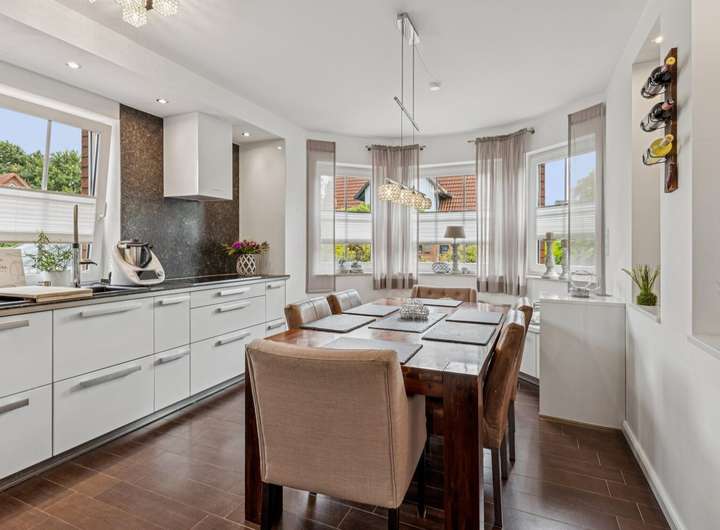 Die Küche ist ausgestattet mit edlen Naturstein-Arbeitsplatten, einer hochwertigen Keramikspüle sowie modernen Miele-Geräten und bildet das Herzstück des Erdgeschosses.