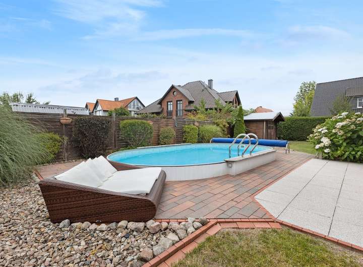 Der Außenbereich begeistert mit einem beheizbaren Pool, dessen komplette Steuerungs- und Bedienanlage komfortabel in der Garage installiert ist. Im Frühling Sommer und Herbst kann dieser über die PV-Anlage beheizt werden.