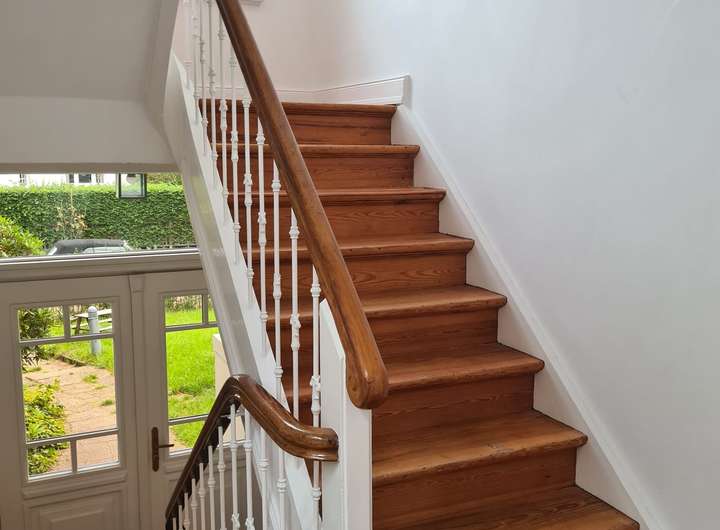 • Originale Stilelemente: Pitch-Pine-Dielen, Stuck, Hohlkehlen, schmiedeeiserne Treppe