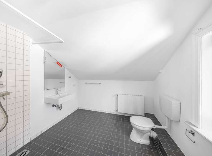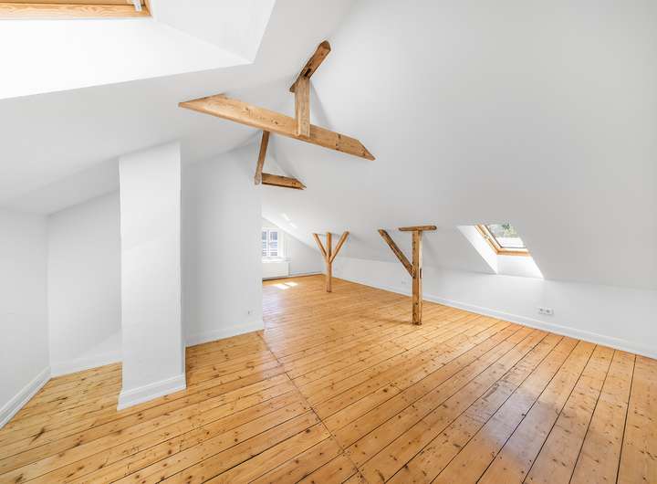 Das ausgebaute Studio (ca. 42 m²) mit bis zu 2,90 m Deckenhöhe und sichtbaren Holzbalken ist ein lichtdurchfluteter Rückzugsort. Ein modernes Duschbad ergänzt die Etage.