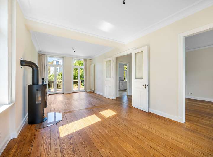 Über die einladende Diele gelangt man in den Wohnbereich mit klassischer L-Form. Große Fenster nach Osten und Westen machen die Räume angenehm hell. Pitch-Pine-Dielen, Stuck und ein moderner Kaminofen (Contura, 2023) schaffen Atmosphäre. Von hier führt der Weg auf die Terrasse (ca. 20 m², Bangkirai-Holz) und in den sonnigen Westgarten.