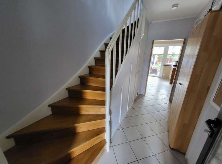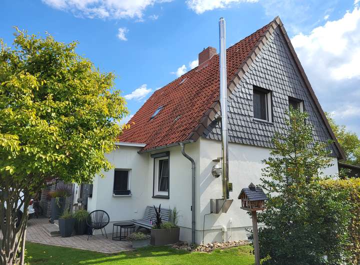 Wohnhaus in massvier Bauweise, Fassade verputzt, Kunststoffhaustür mit Metallkern, Kunststofffenster größtenteils erneuert, größtenteils mit Außenrolläden (Wohnzimmer giebelseitig, Schlafzimmer und Kinderzimmer elektrisch) und Plissees. Innentüren weiß.
