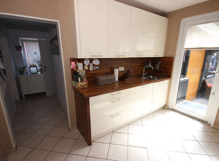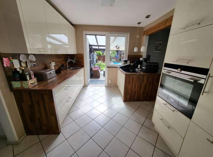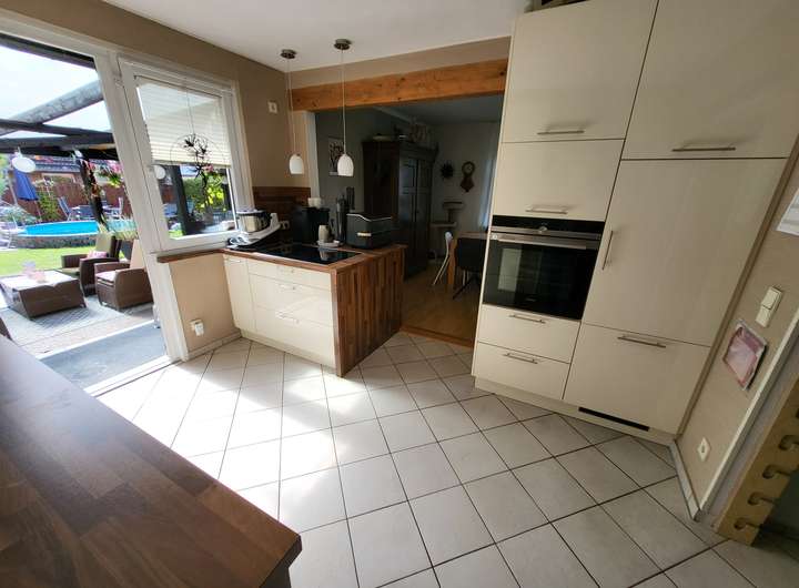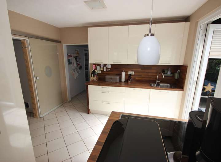 Einbauküche von 2015 mit Siemens-Elektrogeräten. Glasschiebetür zum Flur.