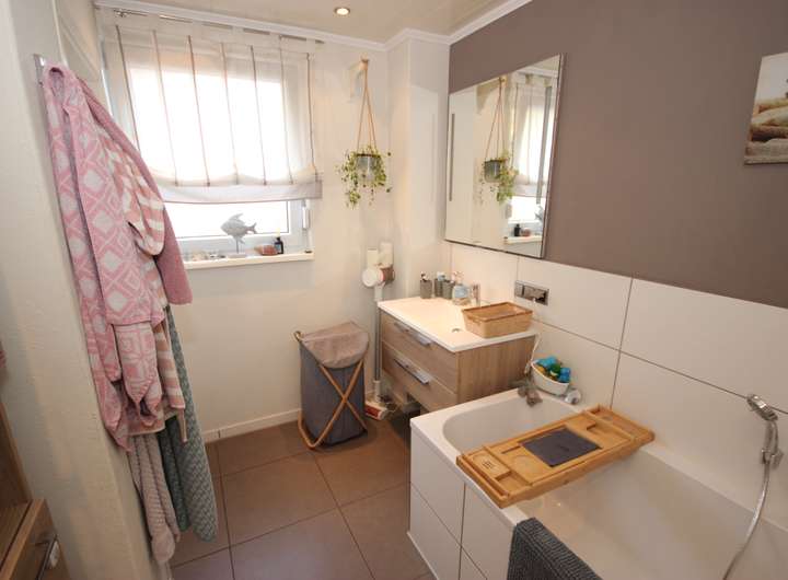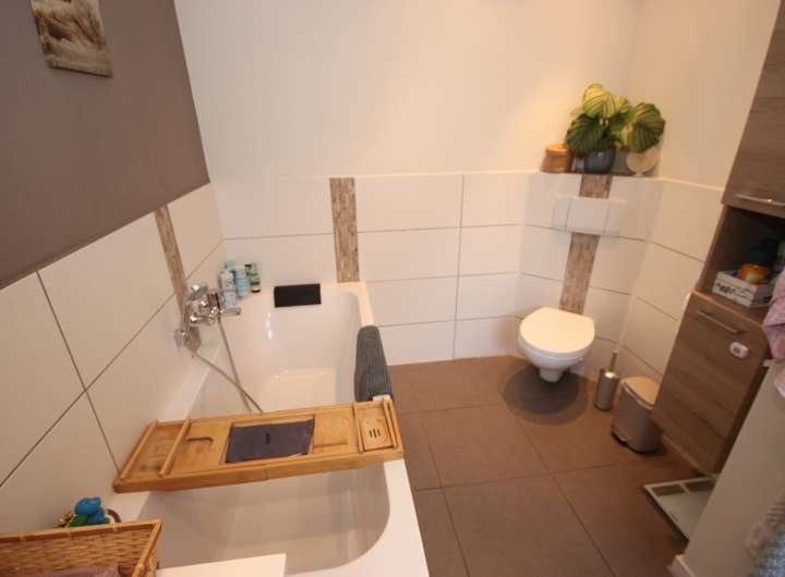 2016 saniert. Fußboden Fliesen, Wände halbhoch gefliest. Badewanne, Waschbecken und WC. Badmöbel.