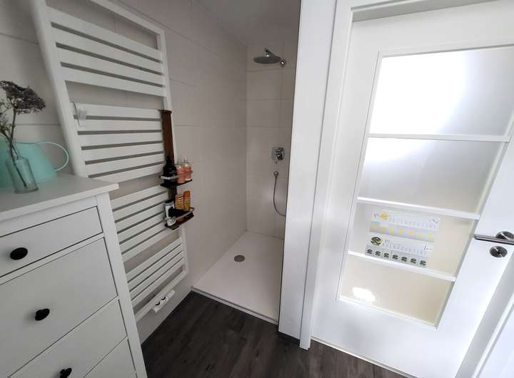 Dusche mit flacher Duschtasse und Regenduschkopf, Waschbecken und WC.