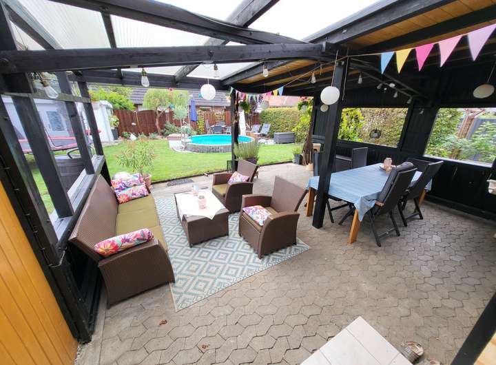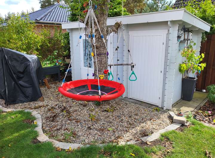 Gartenhaus, Holzunterstand und Feuerstelle..