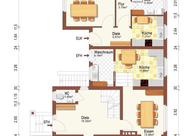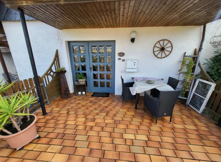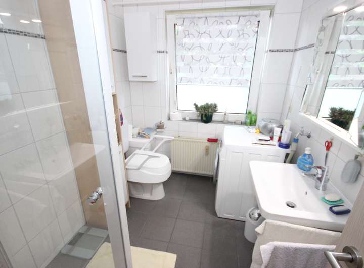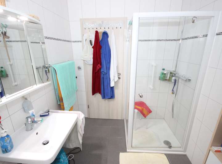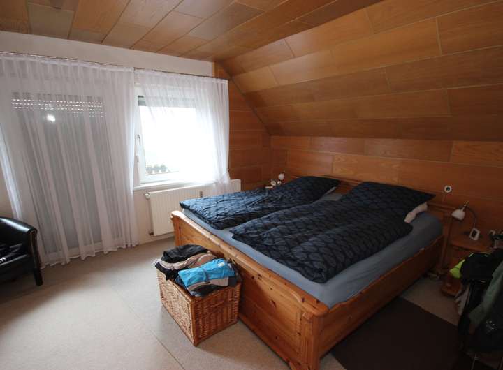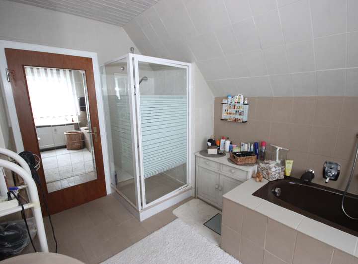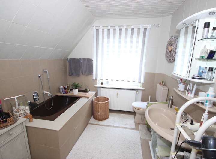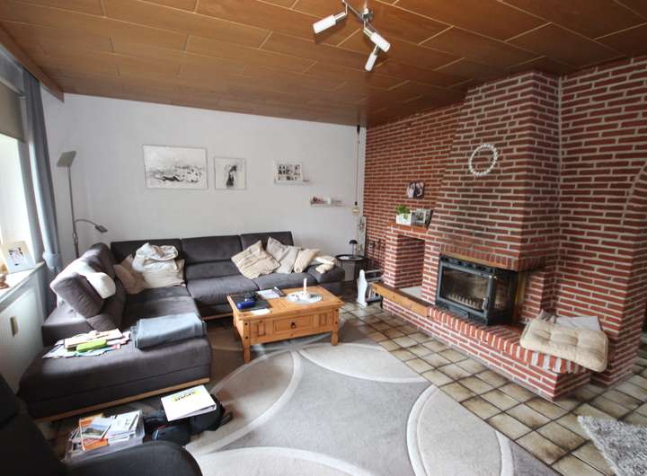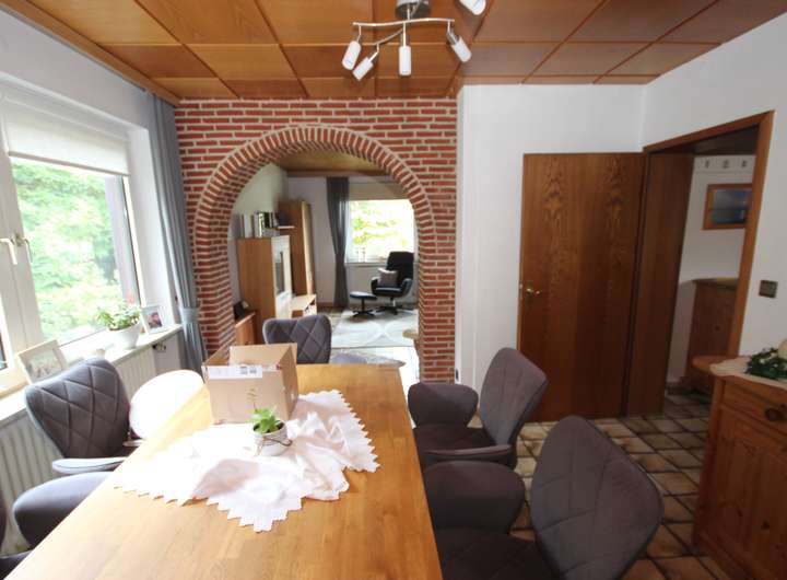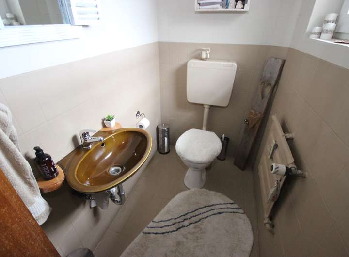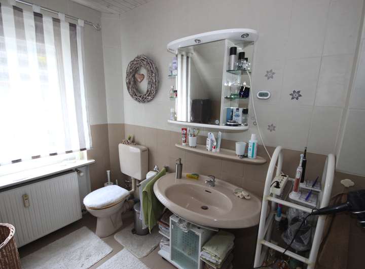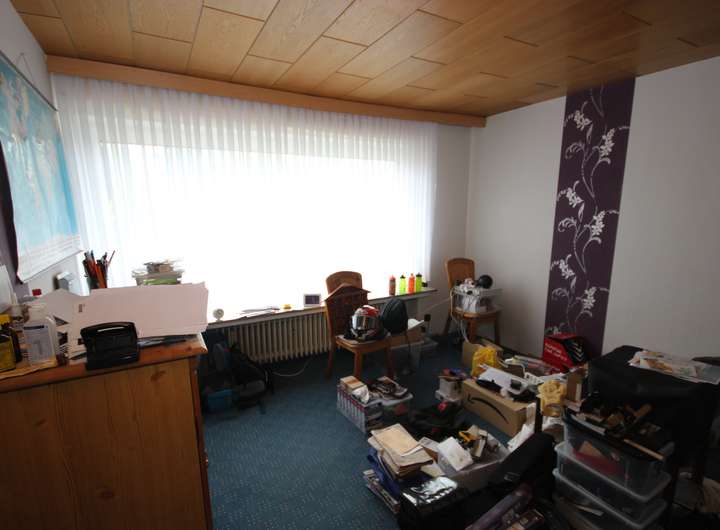 WOHNHAUS: ERDGESCHOSS: Flur: Fußboden Fliesen. Wohnen: Fußboden Fliesen. Gemauerter Kamin. Esszimmer: Fußboden Fliesen. Küche: Fußboden Fliesen. Einbauküche. Büro (Gast): Fußboden Textilbelag. Gäste-WC: Wand- und Bodenfliesen. Stand WC, kleines Waschbecken. Terrasse gefliest. OBERGESCHOSS: Eltern: Fußboden Textilbelag. Kind 1 (Büro): Fußboden Laminat. Kind 2: Fußboden Textilbelag. Badezimmer: Wand- und Bodenfliesen. Badewanne, WC, Eckdusche mit Glaskabine und Waschbecken. Balkon. KELLER: 4 Kellerräume. Ölzentralheizung (Bj. 1980) mit Warmwasserspeicher. Öltanks erneuert. --- EINLIEGERWOHNUNG: Anbau Baujahr 1980. Größtenteils erbenerdig. Wohnen: Fußboden Laminat. Küche: Fußboden Fliesen. Schlafen: Fußboden Textilbelag. Bad: Wand - und Bodenfliesen. Dusche mit Kabine, Waschbecken, WC, Waschmaschinenanschluss. Diele und Flur.
