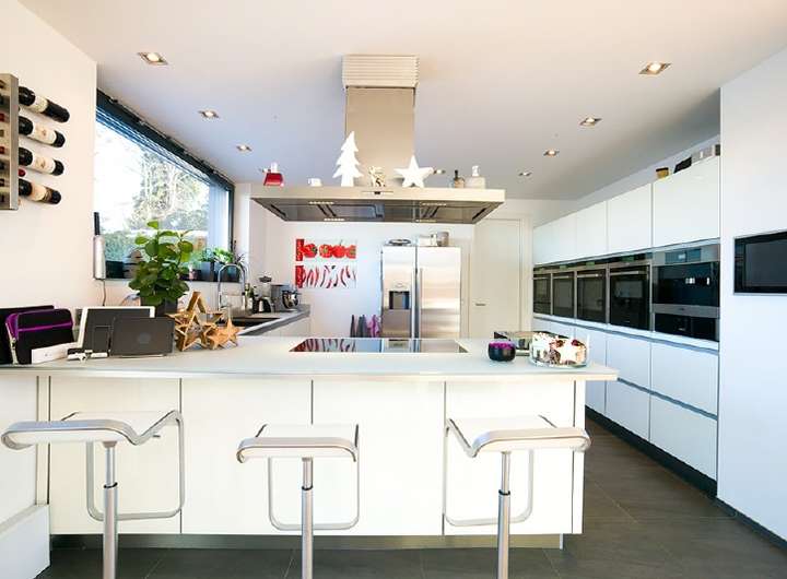 Moderne, weiße Einbauküche mit weißer Glasarbeitsplatte.