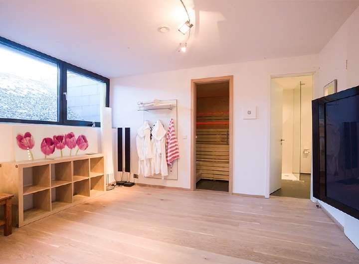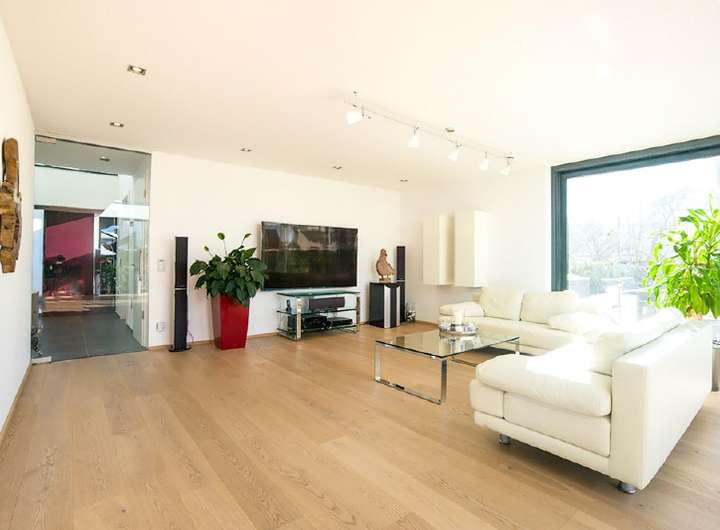 Bodentiefe Fenster sorgen für ein Maximum an Tageslicht und schaffen gleichzeitig eine großzügige und helle Atmosphäre. Die Ausstattung des Hauses ist durchgängig hochwertig: weiß gekalktes Eichenparkett, Fußbodenheizung im gesamten Haus, moderne Einbauküche (Dampfgarer mit Herd, 2 Backöfen, großes Ceranfeld, Mikrowelle mit Tellerwärmer, Kaffeevollautomat, Kühl-/Gefrierkombi mit Eisfunktion, Spülmaschine), moderner Gaskamin im Wohnbereich, drei Bäder mit moderner Sanitärausstattung, zwei taghelle Räume im Souterrain - ein Raum wird derzeit als Wellnessbereich mit Sauna, der andere als Fitnessraum genutzt, etc..