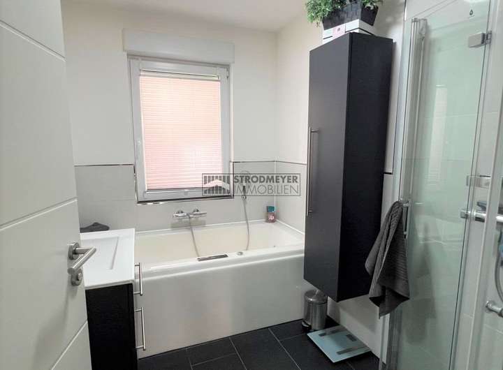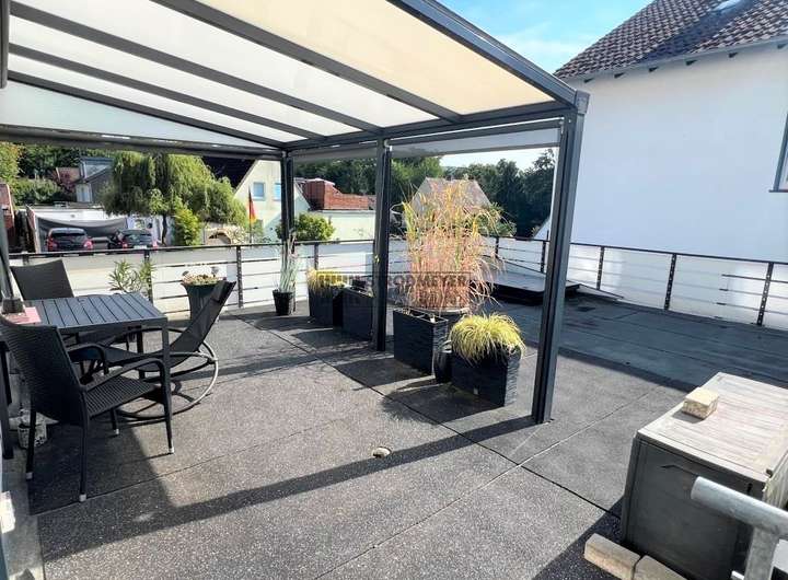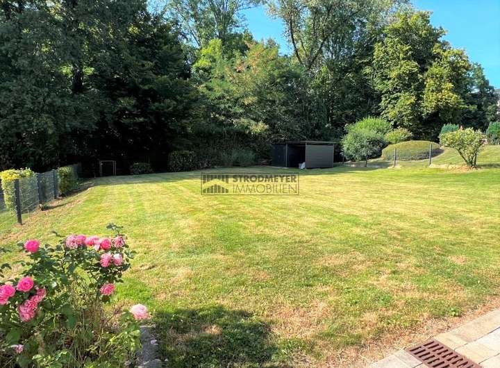 Ein Highlight dieser Wohnung ist die große und zum Teil überdachte Terrasse, die vom Wohnzimmer aus erreichbar ist. Hier lassen sich schöne Sonnentage verbringen. Eine Außentreppe führt direkt auf eine zweite Terrasse und in den tollen und ebenen Garten, in dem Kinder sich frei entfalten können. Hier befindet sich zudem ein hochwertiges Abstellhäuschen für Gartengeräte und Möbel. Das Grundstück grenzt direkt an einen Wald und bietet somit eine ruhige, naturnahe Umgebung.