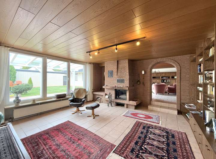 - Erdgeschoss: große Diele mit Essbereich und offen zum Wohnzimmer, Gäste-WC, Küche, Vorratsraum, Hauswirtschaftsraum, Wohnzimmer 1, Kamin-/Wohnzimmer 2, Flur, Kinder-/Arbeitszimmer, Kinderzimmer, Schlafzimmer, Badezimmer