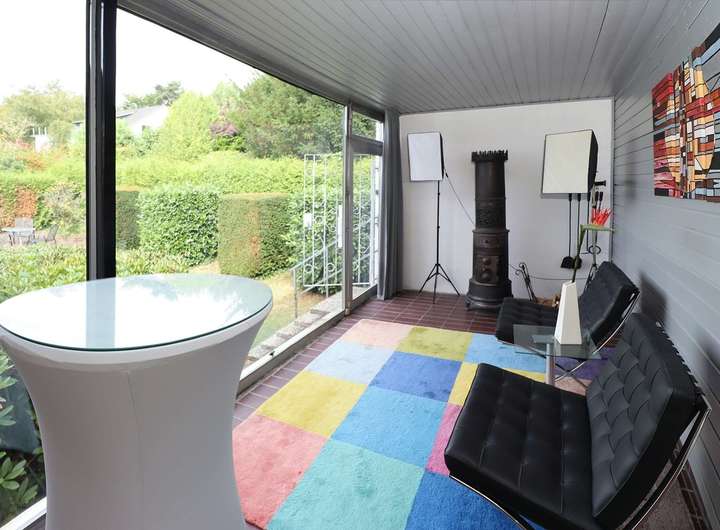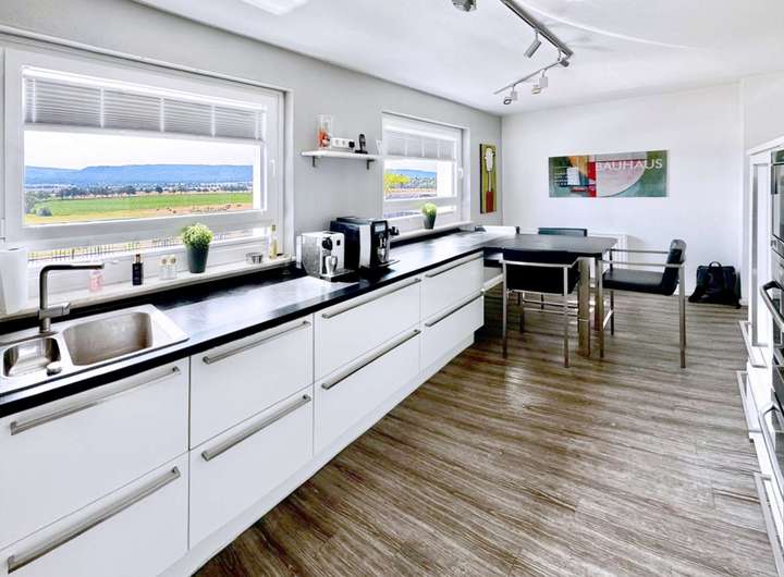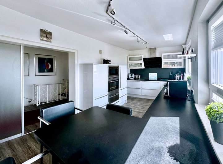 Direkt angrenzend liegt die geräumige Küche – ebenfalls mit beeindruckendem Fernblick. Der private Schlafbereich ist clever separiert und bietet direkten Zugang zu einem modernisierten Duschbad mit Fußbodenheizung und hochwertiger Ausstattung. Ein stilvolles Arbeitszimmer, ein Gäste-WC sowie ein gemütlicher Wintergarten auf der Rückseite des Hauses runden das Raumangebot auf dieser Ebene ab.